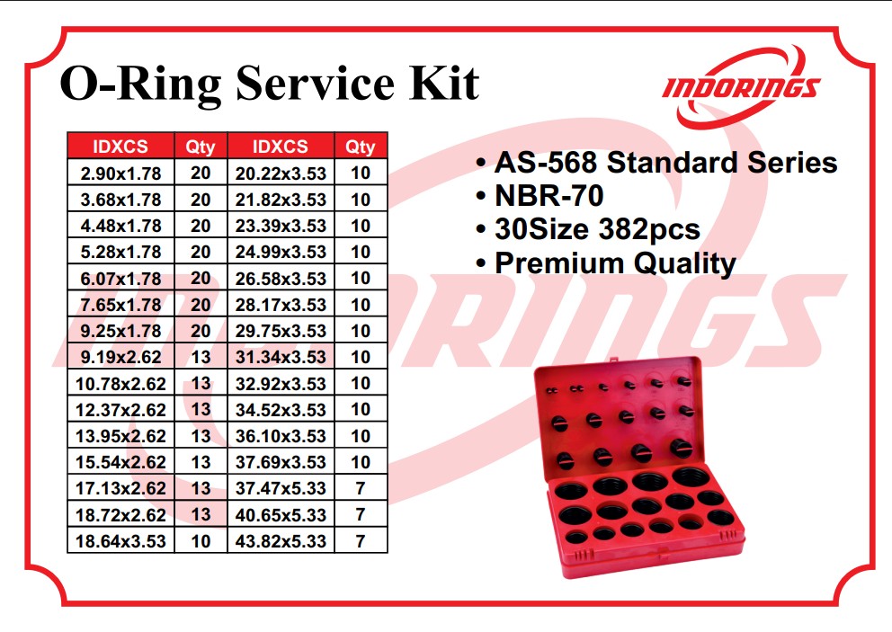 O-RINGS KITS ARE USED TO STOP LEAKAGE OF GASES OR FLUID OR AT TIMES JUST USED FOR PACKING PURPOSE IN VARIOUS DYNAMIC AND STATIC APPLICATIONS.